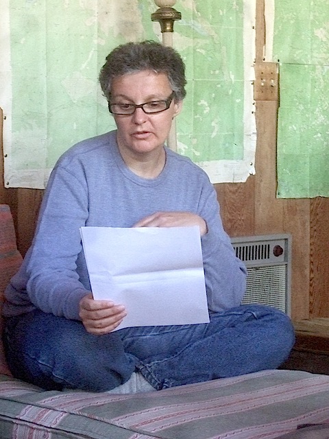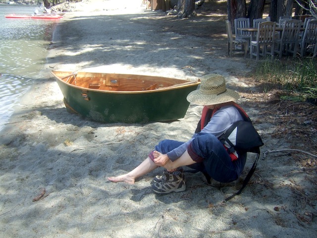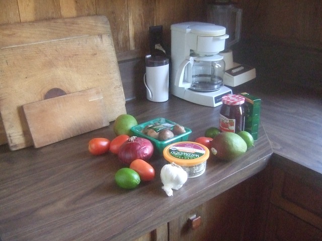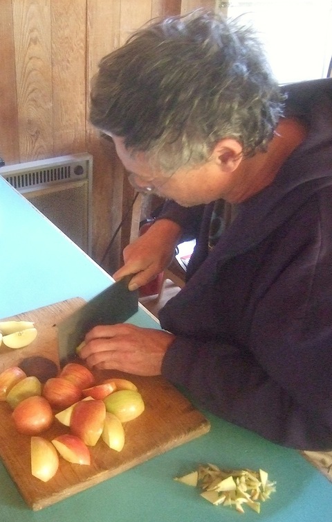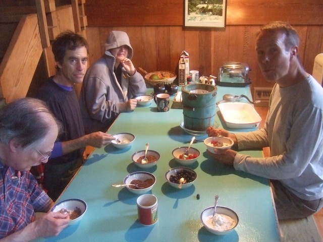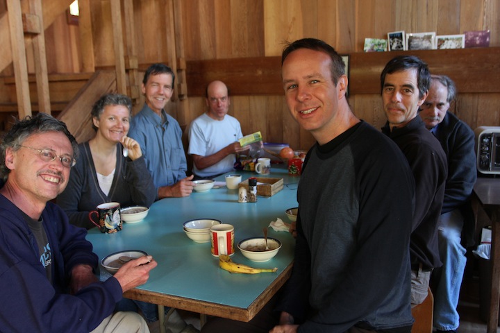 We ate together at a table and took turns cooking and dishwashing, dividing responsibility for cooking breakfasts and dinners. We saved on dishes by adopting personal cups for the duration. Lunches were self-made from available supplies. Inevitably some people functioned more as head cooks than others, but good cheer prevailed overall. The meals were simple and included pasta, salads, plain lentils, leftover lentils spruced up with carrots and spices, steamed kale, the fish, and so on. Oatmeal and oat bran with fruit made a couple of the breakfasts, and we had French toast once toward the end. There was plenty of fruit and juice.