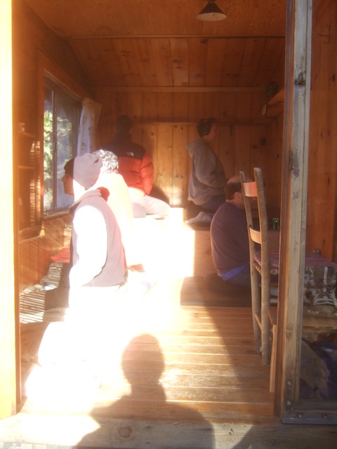 We met formally as a group for practice discussion and day-planning each morning. Because none of us was a formal "teacher" we all took turns speaking during the meetings. Retreatants who had more experience in group practice tended to say more and to lead more as well, but everyone had plenty of chance to share without coercion. We talked about the future of autism, anxiety, practice goals and obstacles, the significance of dreams, the Lakota story of Jumping Mouse, Kyosei's comments in Case 46 of the Blue Cliff Record, and so on. We talked about different forms of meditation, and about prayer and God-centered practice.