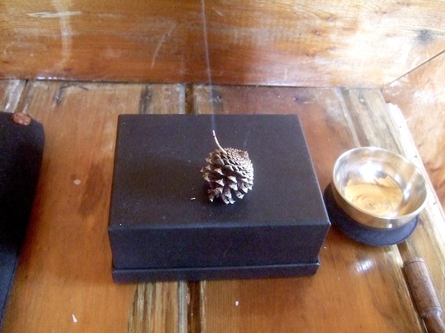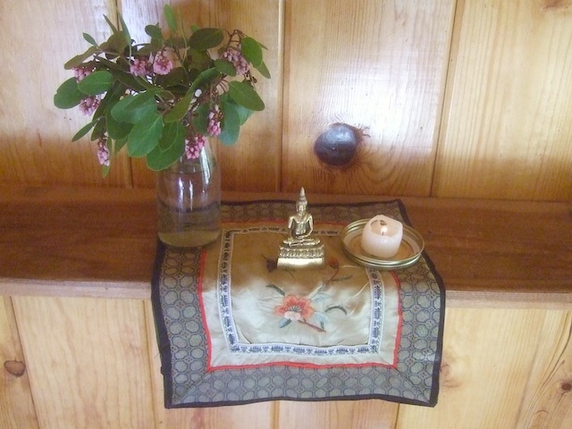 The altar flowers were Manzanita, and the incense was an autism-friendly pine needle that not only did not smell of perfume but self-extinguished in seconds. We used the brass bell to time sittings and tapped the black cardboard box gently to pace chanting on the few occasions we did it. (A small wooden "mokugyo" would have sounded better.)