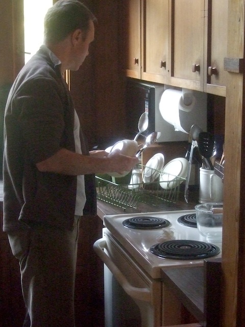 It wouldn't be a proper meditation retreat without conscientious labor, and there was that. Work included food preparation, cabin maintenance, laundry, sweeping and mopping, hauling and stacking firewood, repairing rock-work, and restoring the cabin to a pristine condition at our departure -- "leaving no trace". Some of the work was obvious and needed no assigning. Other work people volunteered to do, and some was set in motion by those familiar with the needs of the cabin and its maintenance. The obsessive-compulsive tendency often present in autism made some of us naturals at tidying up.