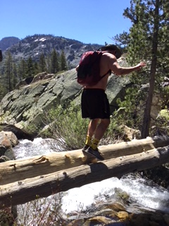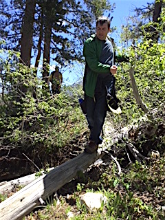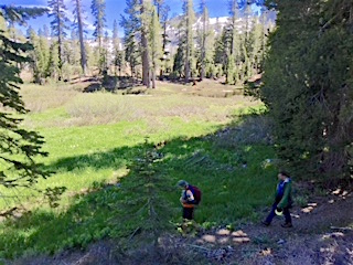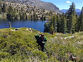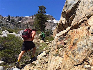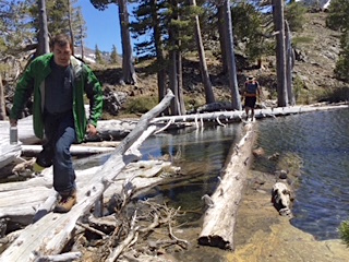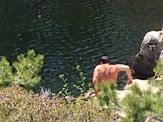 After losing and recovering a light-saber water bottle, we made it to Susie Lake where John, veteran of a swim across the English Channel, went for a dip (the white streak on the left there) and commented, "It's colder than the Bay." Indeed. That's a practice to focus the mind.